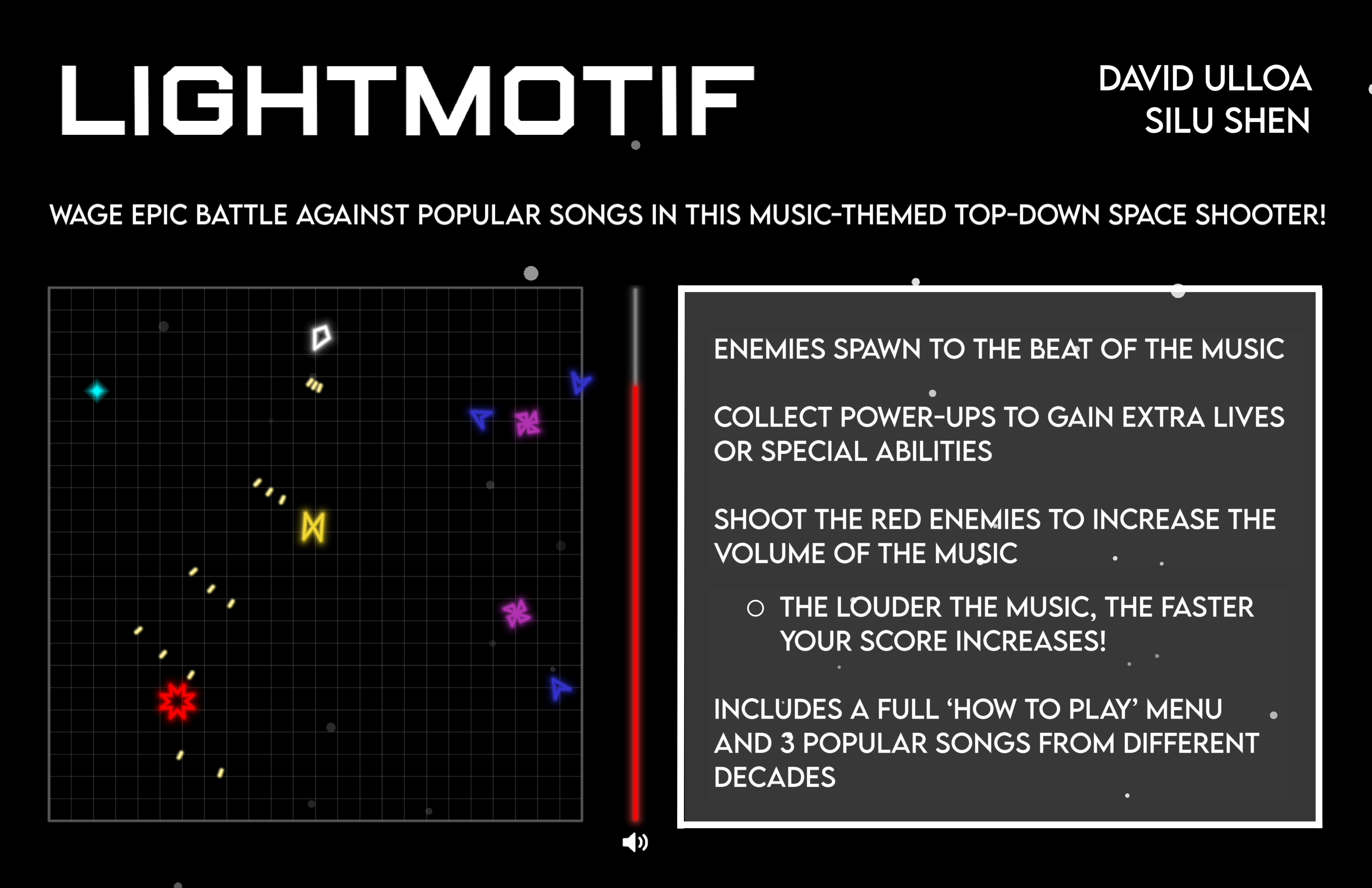 Lightmotif is a top-down rhythm-based shooter. Fire bullets and collect powerups to defeat enemies that spawn in time with the music and reach the end of the song to win. The game was made entirely in Python with one other person over the course of about a month. I was responsible for the main game screen: the game mechanics and the graphics. My partner did all the UI, the tutorial, and the graphic above.
