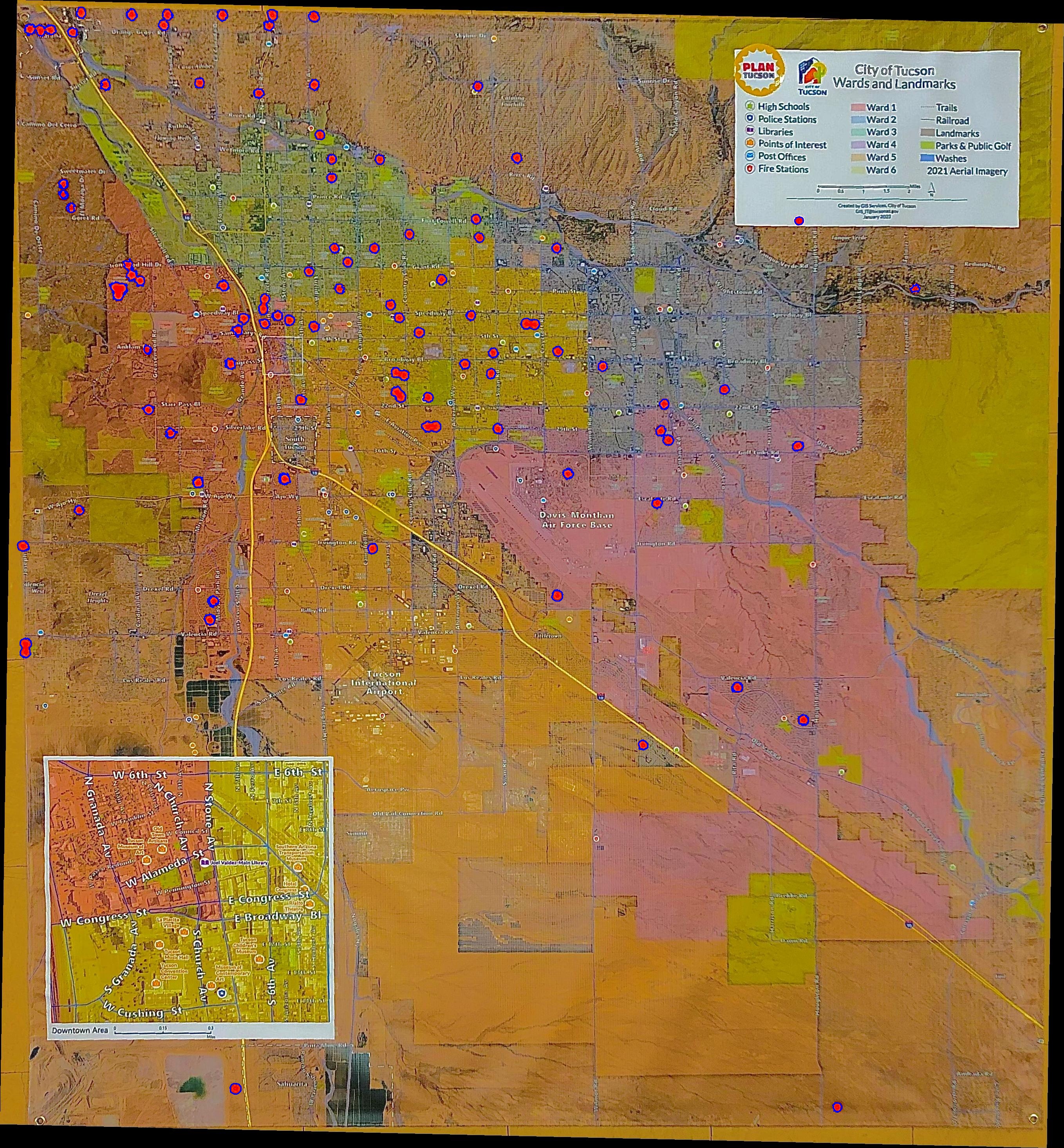 In January 2023, I worked at the Department of Planning & Development for the City of Tucson, AZ. I was given this task: As part of their data collection project, I needed to create a program that could take a picture of a large map with stickers on it and convert that into data that could be imported into GIS. Here's what I created: